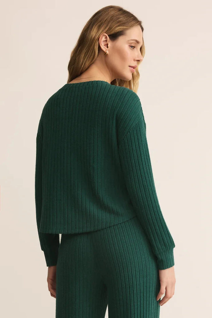 Crafted in silky rib knit, this long sleeve top delivers a smooth, body-skimming fit. Designed for easy layering, it pairs perfectly with matching bottoms or your favorite lounge pants.