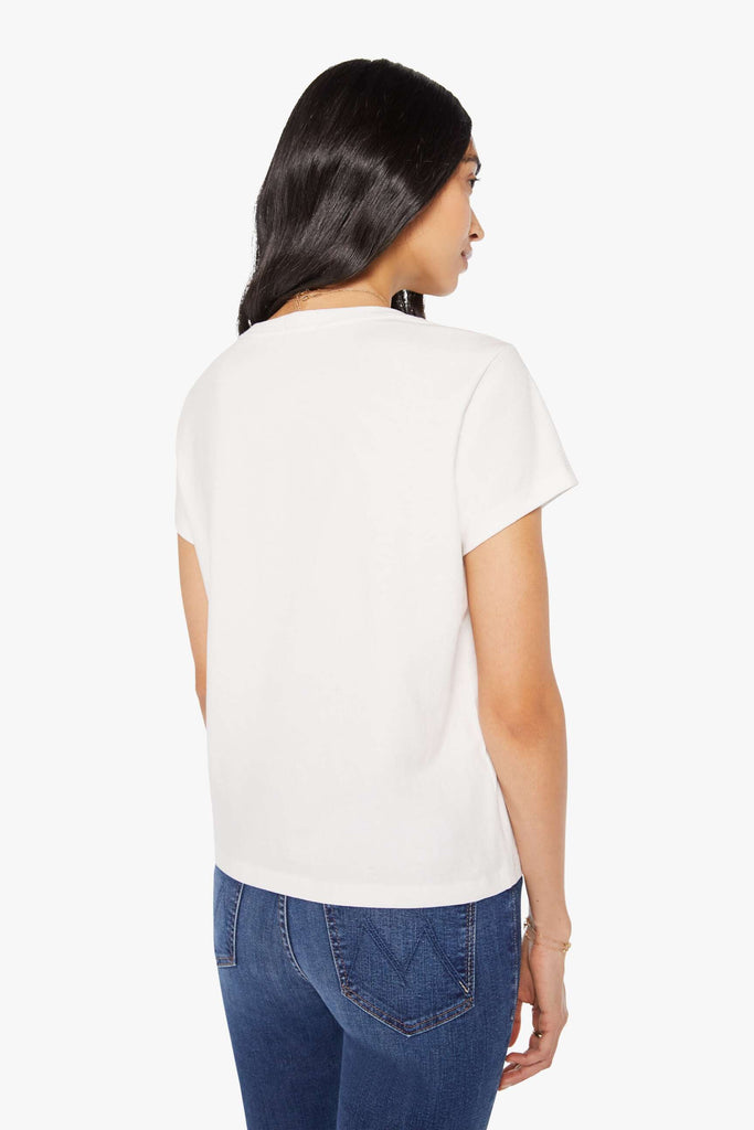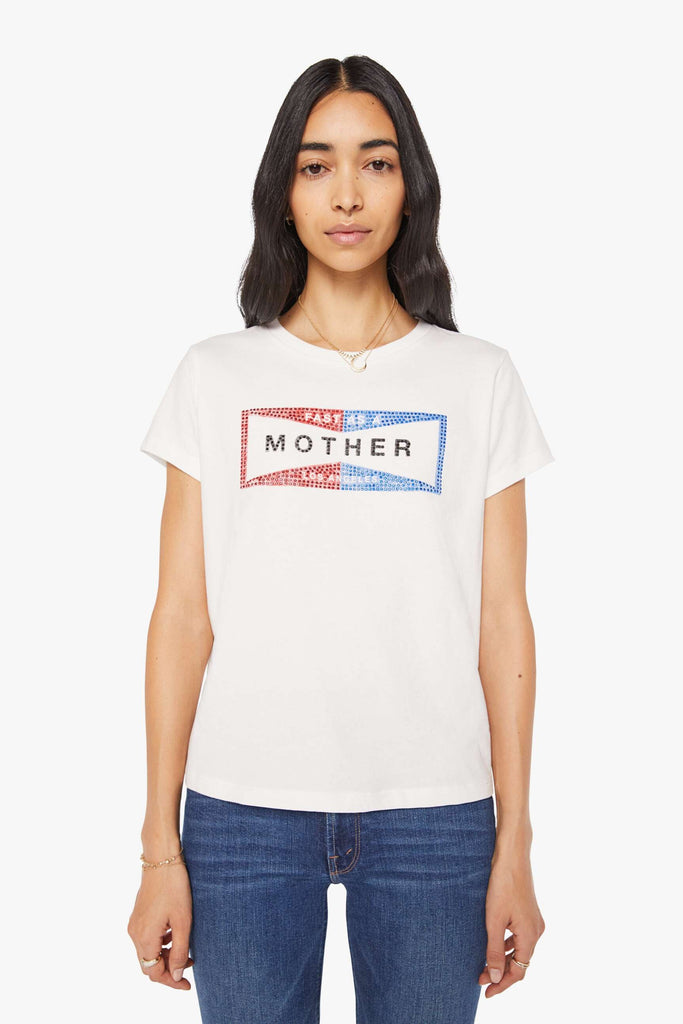 Catch me if you can. A soft crewneck with a slim fit for a vintage look and feel. Made from 100% cotton in white, The Boxy Goodie Goodie in Fast As MOTHER features a faded red and blue graphic embellished with metallic rhinestones and MOTHER across the front.