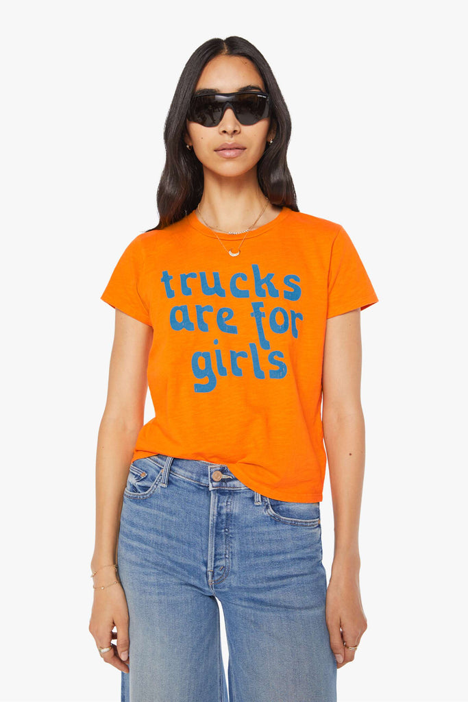 Haulin' sass. A soft crewneck with a slim fit for a vintage look and feel. Made from SUPERIOR 100% cotton, the tee is designed in bright orange with a blue text graphic on the front that reads "trucks are for girls." Honk if you're jealous.